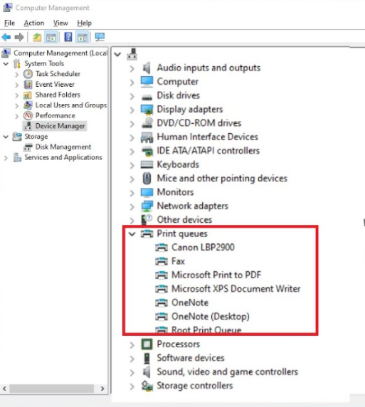 - Once ‘Device Management’ window opens, navigate to “Print queues” category and expand it.
