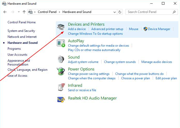 Navigate to the control panel and select > Hardware and Sound > Devices and Printers.