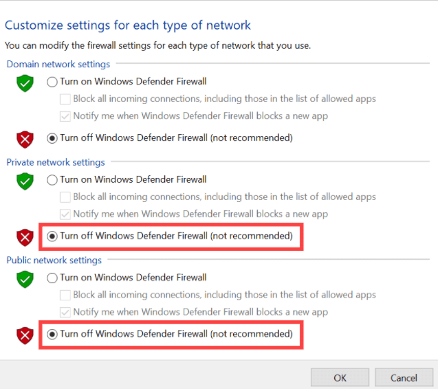 - Next, deactivate Windows Defender Firewall for both public and private networks. Afterwards, click on OK to confirm the modifications.