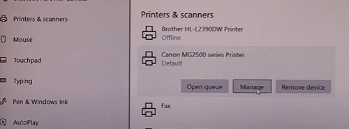 - Select printer and Scanner from left section > and choose your model > select manage tab.