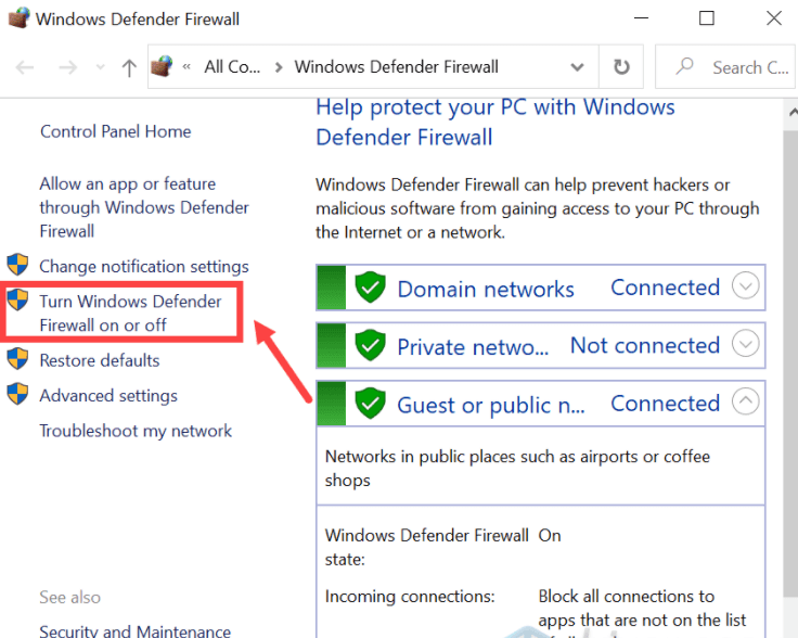 - Then, click on ‘Turn Windows Defender Firewall on or off’ option from the left side of the window.