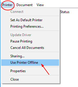 - Now, ensure that ‘Use Printer Offline’ option is Not selected. If √ is marked, click to uncheck it.