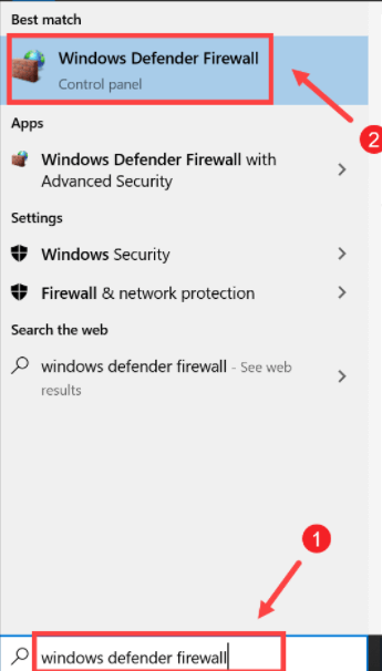 - Type ‘Windows Defender Firewall’ in the search bar and click on it.