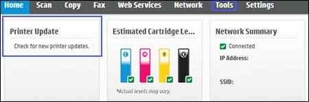 - On the EWS home page, select the Printer Update tile. If not found, go to Tools > Printer Updates > Firmware Updates.
