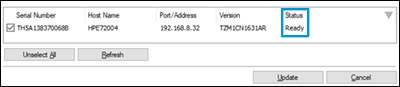 - If the status reads ‘Ready’, tick the checkbox adjacent to the serial number, then click ‘Update’.