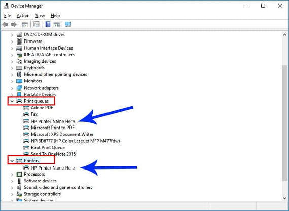 Next, the ‘Windows Device Manager’ screen will open. Next, double-click on the “print queues” category to make it larger, as seen in the picture below.