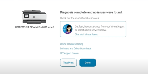 - In case no issues are detected, click on “Done” and proceed to the next HP printer troubleshooting step.