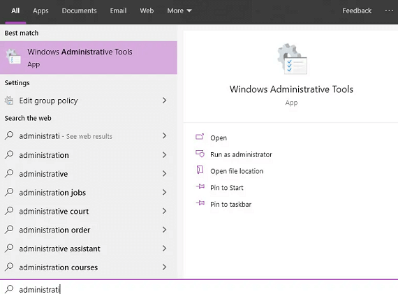 Navigate to the “Start” icon, enter “Administrative Tools” into the search field, then select “Services” after that.
