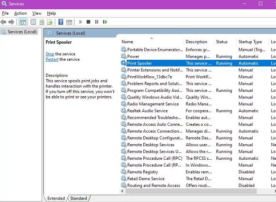 - Next, scroll through the list to find ‘Print Spooler’. Right-click on it and then select ‘Stop’.