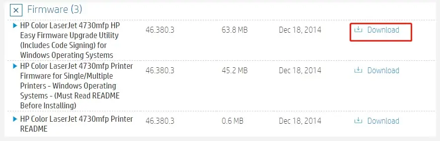 - Choose ‘Firmware’ from the drivers list, select the download option next to the update, and proceed by following the provided instructions.