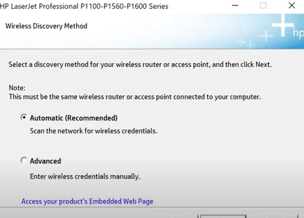 - When prompted for a wireless discovery method, choose the ‘automatic’ option. This will scan the computer for wireless network.