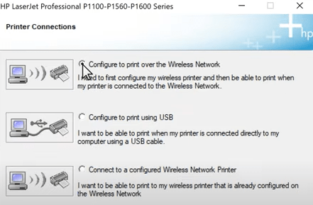 - Now, choose the option ‘configure to print over the wireless network’ and click ‘next’.