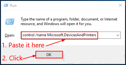 - Type this command in the Run dialog box- control/name Microsoft.DevicesAndPrinters