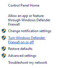 - Choose the “Turn Windows Defender Firewall on or off” option.