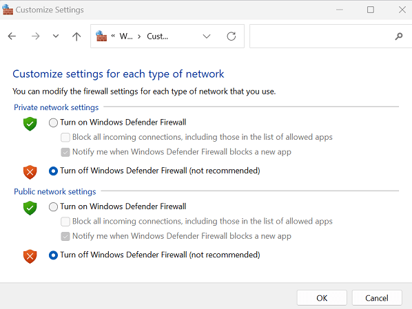 - Under both Private and Public network settings, select the radio button that says “Turn off Windows Defender Firewall (not recommended).” Confirm by clicking OK.