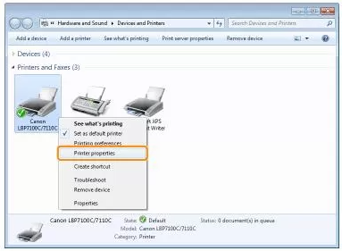 • Here, choose “Properties” after right-clicking on your Canon printer’s model name.
