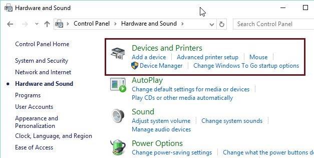 • Go to ‘Hardware and Sound’ and choose ‘Printers and Devices’.