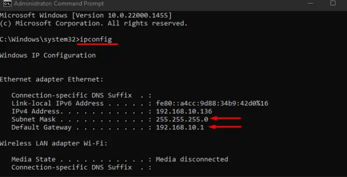 • Press enter after typing “ipconfig” to see the default gateway and subnet mask.