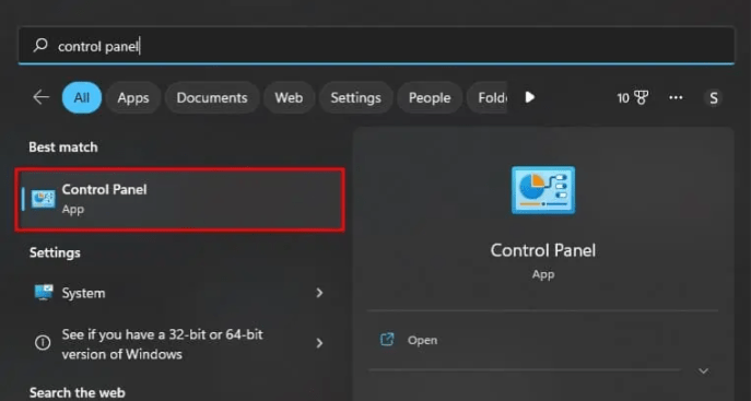 • Open the Control panel by Windows search.