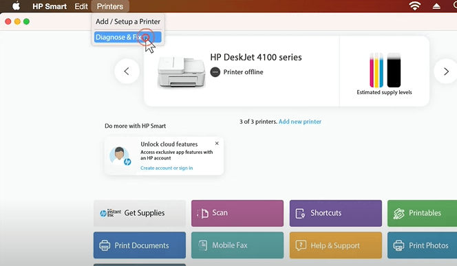 • Choose your printer from the HP Smart App. Choose the “Diagnose and fix” option after clicking on “printers” in the top menu bar.