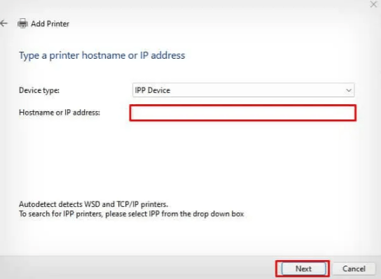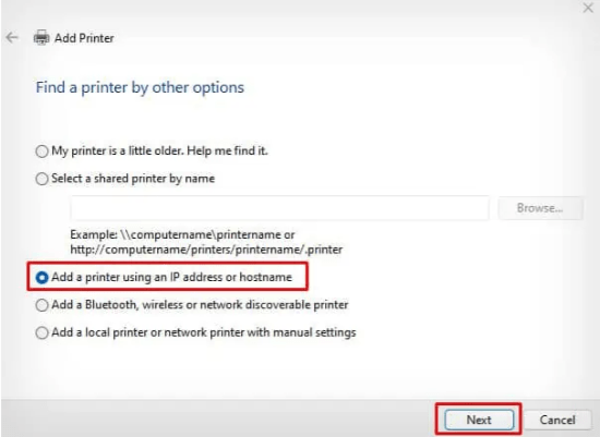 • Click “Next” after checking the box labeled “Add a printer using an IP address or hostname”.