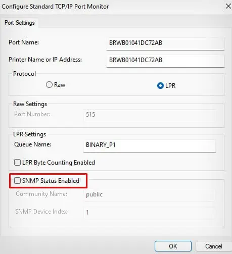 • Make sure that ‘SNMP Status Enabled’ is not selected and then click OK to save your modifications.