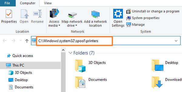 • Next, open File Explorer. You can do this by clicking on the folder icon in your taskbar or by pressing the Windows key and the letter ‘E’ at the same time. Once File Explorer is open, navigate to the following location: “C:\Windows\System32\Spool\PRINTERS”. To move to this location, simply type it into the address bar at the top and press ‘Enter’ on your keyboard.