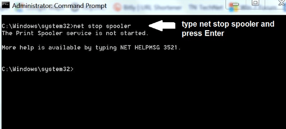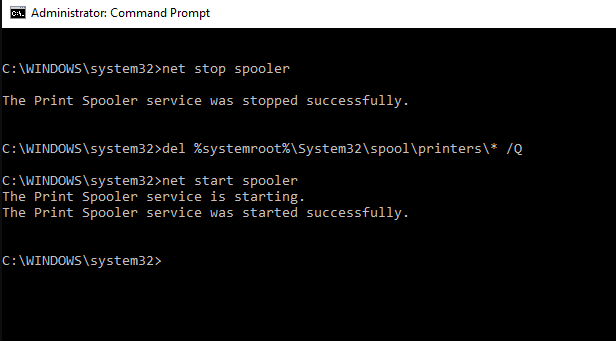 • Type ‘del %systemroot%\System32\spool\printers* /Q’ and press “Enter”.