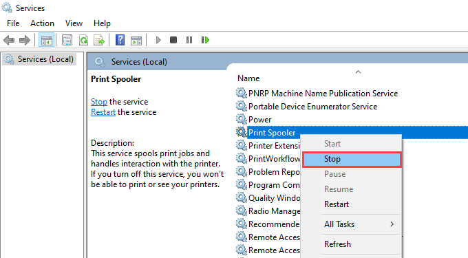 • Now, in the Services window that appears, scroll down until you find an option called “Print Spooler.” Click on it, and then select “Stop” to pause this service temporarily.