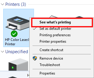 - Now you will see your HP printer amongst the shown printers. Right click on that printer and from the drop-down list pick “See what’s printing.”