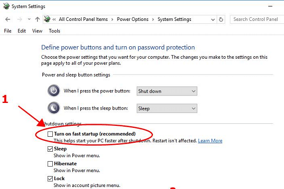 • Now uncheck the ‘Turn on fast startup (recommended)’ option. Then click on ‘Save changes’.