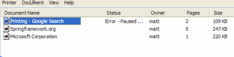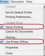 - Click on ‘Printer’ tab and select to clear any selections made next to ‘Pause printing’ or ‘Use printer offline’. There should be no check mark on them.
