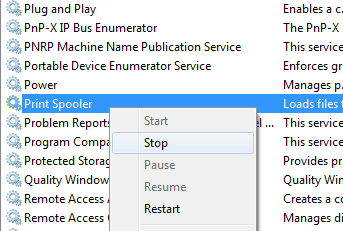 - From the given list scroll down to ‘Print Spooler’ option. Right-click on it and select ‘Stop’ option.