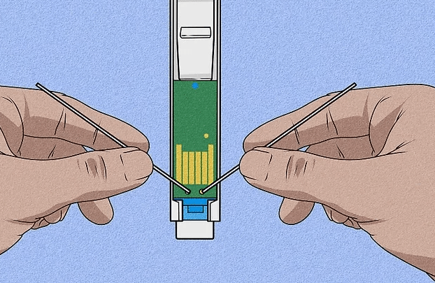 • Now, you’ll be reinserting the original chips back into each cartridge. This step ensures that both cartridges register the same ink level.
