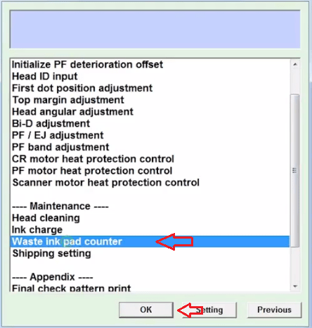 • You will soon see a new window opening on your screen. Click on the ‘Waste ink pad counter’ option (from the maintenance section).