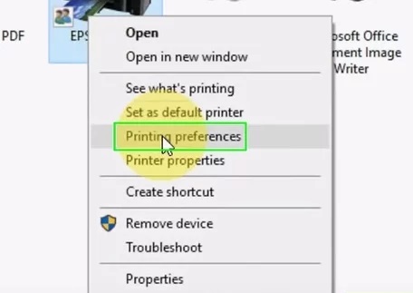 • Thereafter, select your printer from the next appearing screen and right click on it. From here, select ‘printing preferences’.