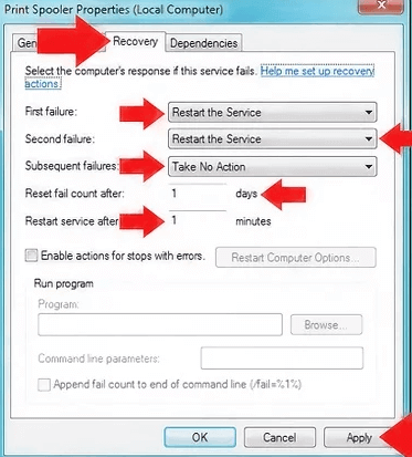 - Next go to the ‘Recovery’ tab and from ‘First failure’ option, select ‘Restart the Service. Now click on the ‘Apply’ button to save settings.