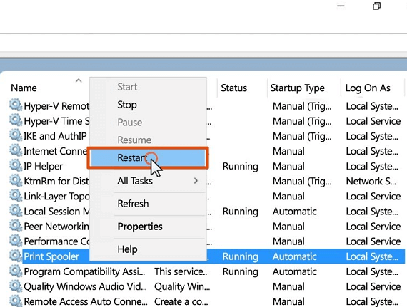 - Again go to the ‘Spooler Service’ option and click on the ‘Restart’ option again.