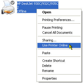 - Now from the displayed printer list, right click on your shown HP printer and uncheck the option “use printer offline”.