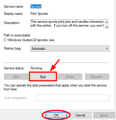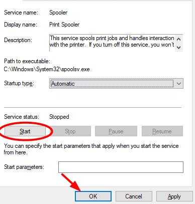 - Open the services window again and right-click on the “Print Spooler” to open properties. Here, click on the start option & click on “OK” button.