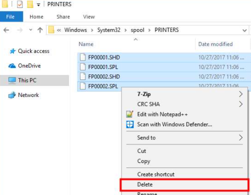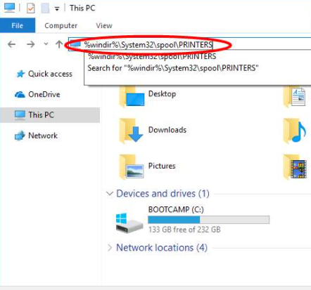 - Press the “enter” key after copying and pasting this into the address bar of “%windir%\System32\spool\PRINTERS.”