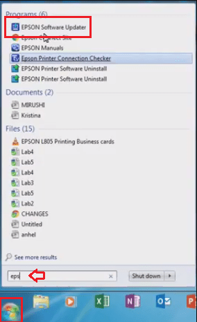- Open the start menu and type “Epson”. Here, choose “Epson Software Updater” from the results that are displayed.