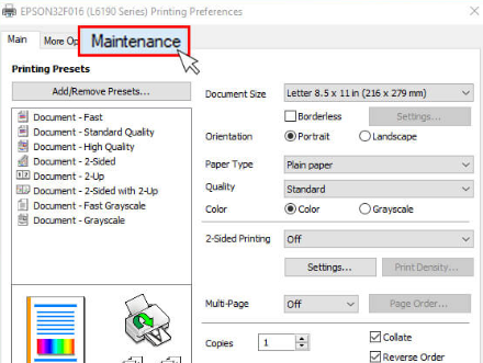 - Next, select “Epson Status Monitor” from the maintenance menu by clicking on it.