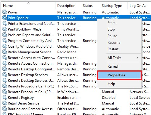 - Then, navigate to the print spooler in the service window, point at it, and right-click to access the “Properties” menu.