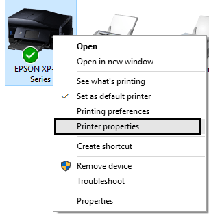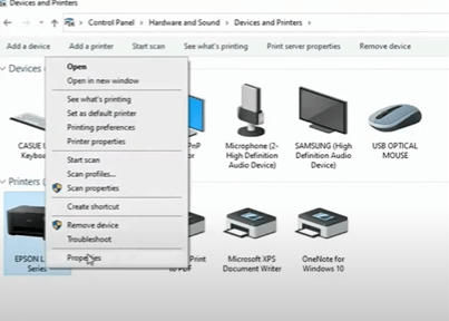 - Here, you will be able to see your installed Epson printer with a Green check mark on it. When you perform a right-click on it, choose “Properties.”