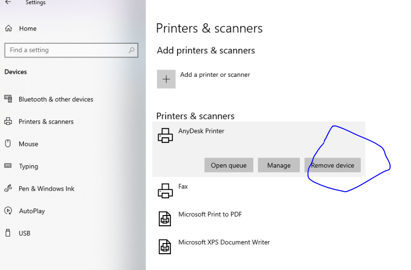 - Locate your printer listed under ‘Printer & scanners’, select it, and then click ‘Remove device’.