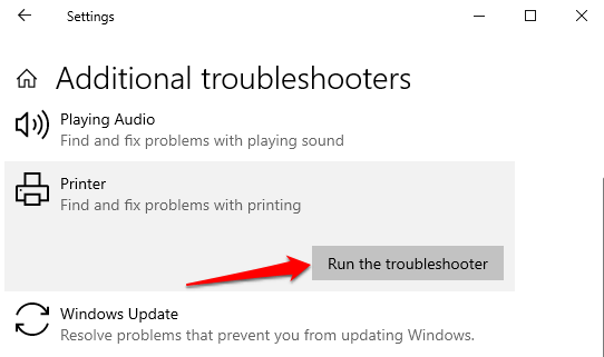 - Alternatively, access the printer troubleshooter in Windows 10 by going to Settings > Update & Security > Troubleshoot. Choose “Additional troubleshooters,” then select “Printer,” and click on “Run the troubleshooter.”