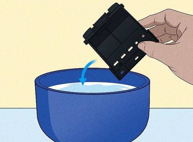 - Allow the printhead to soak for approximately ten minutes. Then, remove it from the container and place it on a dry paper towel for fifteen minutes, with the nozzle facing upward.