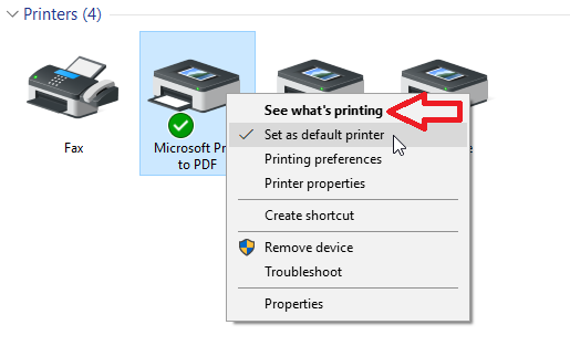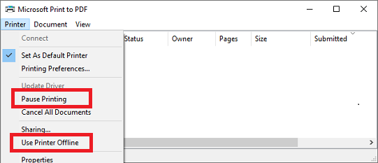 2. Make ‘Printer offline’ and ‘Pause Printer’ option uncheck