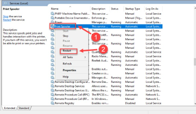 - Thereafter, again go to the print spooler service and right-click on the ‘Restart’ option.